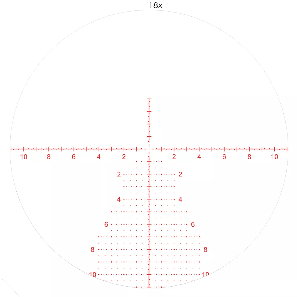 Масштабируемая прицельная сетка AM318 расположена в первой фокальной плоскости и покрывает потребности самых распространенных сценариев охоты. На минимальной кратности стрелок может быстро захватить цель в Т - образное перекрестие. Повышение кратности до 18х дает хорошую видимость горизонтальной разметки и вертикальной «елочки» для оперативного ввода поправок.