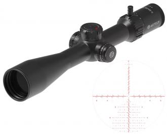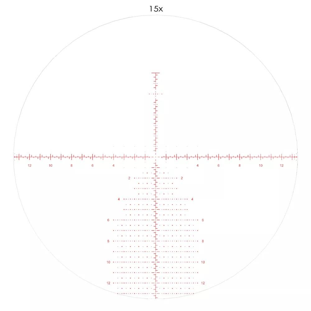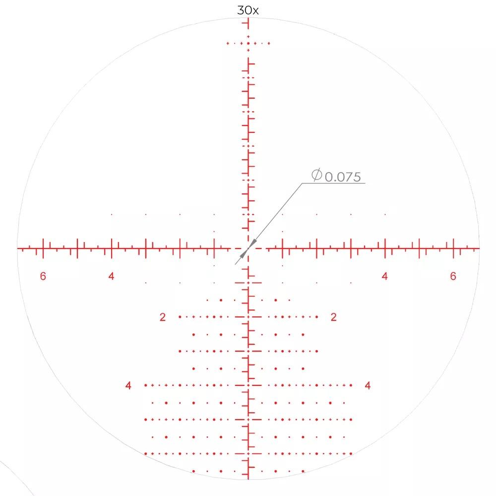 Прицельная сетка AM530 расположена в первой фокальной плоскости (FFP) и изменяет свой масштаб согласно установленной кратности. T - образное перекрестие не препятствует обзору и позволяет быстро захватить цель на минимальной кратности 5х. Выставив увеличение в диапазоне от 15х до 30х, стрелок получает возможность оперативно вносить поправки с помощью информативной разметке по горизонтали и вертикальной «елочки».