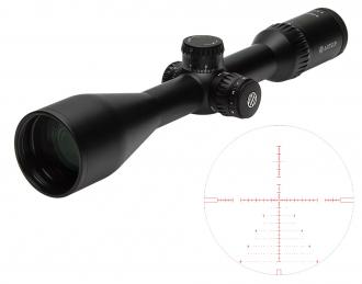 Прицельная сетка AM1 расположена в первой фокальной плоскости и изменяет свой масштаб в соответствии с кратностью. Информативная разметка по обеим осям дает возможность вносить корректировки при стрельбе выносом.