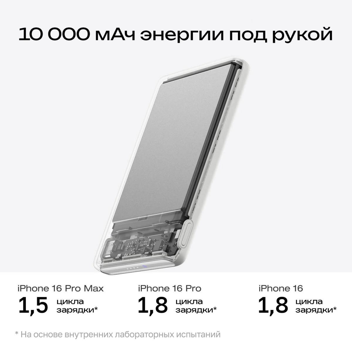 Литий-кобальтовый аккумулятор ёмкостью 10 000 мАч в ультратонком корпусе. Легко скрывается в карманах брюк, узкой сумке для ноутбука или клатче.